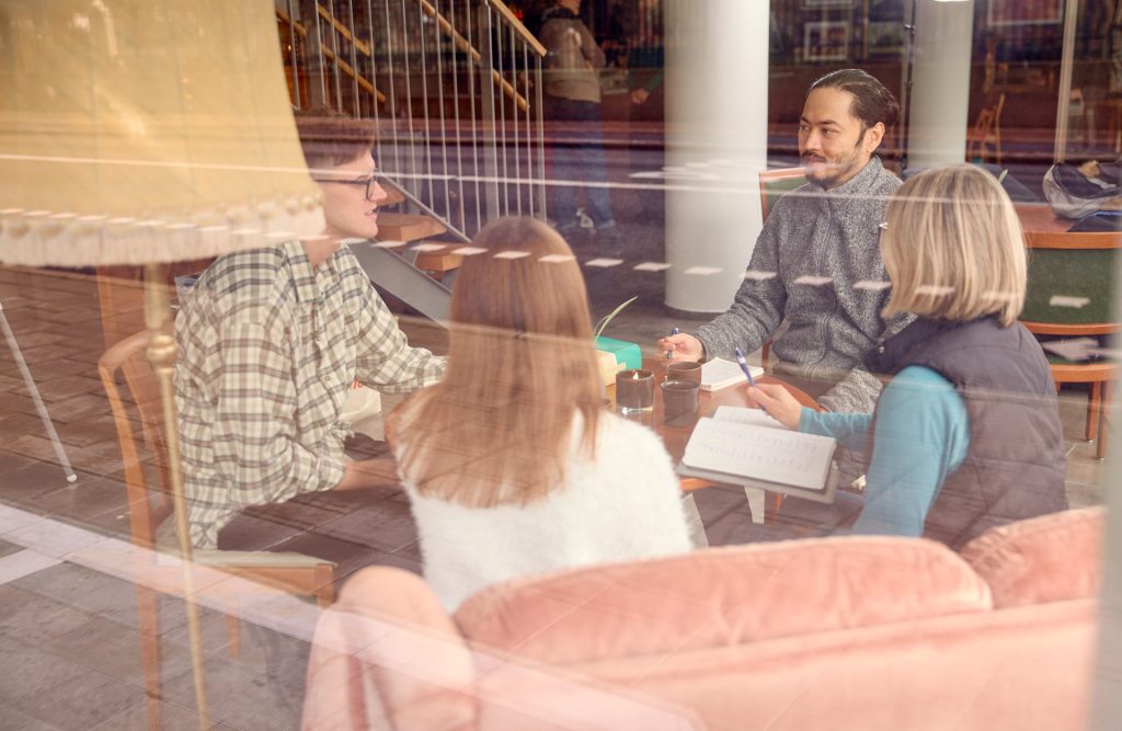 We speak Swedish together in a safe and friendly environment. One of our SFI teachers leads the conversation.